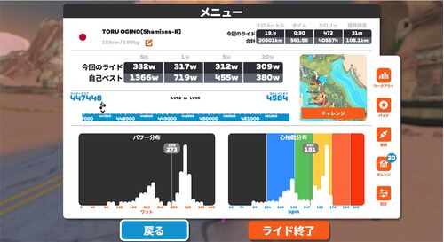 昨日ライブ配信みてテンション上がったのかなかなか寝付けず… 眠い目こすりながら出社 二日を予定してた作業が一日でおわって多幸感 定時で帰宅してローラーへ いいズイレーなかったのでワークアウトを step by step 設定パワー的に行けるやろって思ったけど…